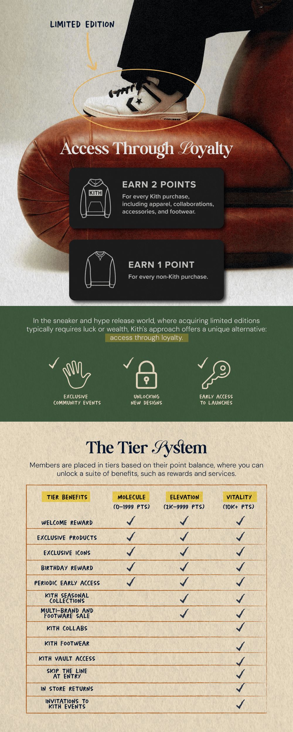 In the sneaker and hype release world, where acquiring limited editions typically requires luck or wealth, Kith's approach offers a unique alternative: access through loyalty.